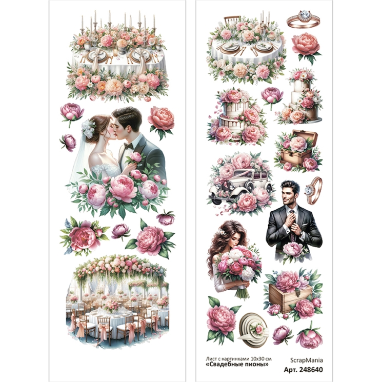 0 отзывов к товару Лист с картинками 10х30 см "Свадебные пионы" (ScrapMania), 180 гр/м2